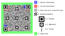 A QR code (quick-response code) is a type of two-dimensional matrix barcode, invented in 1994, by Japanese company Denso Wave for labelling automobile parts.[1][2] A QR code consists of black squares arranged in a square grid on a white background, including some fiducial markers, which can be read by an imaging device, such as a camera, and processed using Reed–Solomon error correction until the image can be appropriately interpreted. The required data are then extracted from patterns that are present in both the horizontal and the vertical components of the QR image.[3]