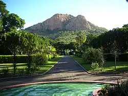 The formal entrance draws pedestrians down the southeast-northwest axis, which is flanked on either side by mirrored golden cane palms, formal annual beds and mazes. The granite rock face of Castle Hill dominates the vista of the southeast-northwest pedestrian path. The southeast-northwest and northeast-southwest paths intersect the central axis fountain, which is enclosed by a vine arbour and seating. Adjacent to the central fountain feature is a significant mango (Mangifera indica) and governors plum trees (Flacourtia jangomas).[2]