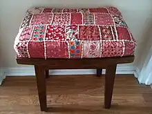 A decorative use of quilting: a stool upholstered with quilted and embroidered fabric from India.