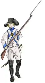 The regimental uniform was as follows: white coat, blue collars, cuffs and lapels, white turnbacks with blue fleur-de-lis, while shoulder straps edged blue, brass buttons stamped with three fleur-de-lis and '1'; white waistcoat and breeches, black bicorne with white cockade and cockade loop. The regiment was armed with the Charleville M1777 infantry musket with white accoutrements. Grenadiers had a bearskin cap with a brass plate stamped with fleur-de-lis, white cords and red plume, red fringed epaulettes, red (flaming grenade turnback ornaments). Drummers wore French Royal livery: blue coat with red facings, a white chain on crimson livery lace. The uniform was of French Royal Army style, cut according to 1791 regulations: non-commissioned officers had French rank distinctions while officers had gold buttons and epaulettes.[1]