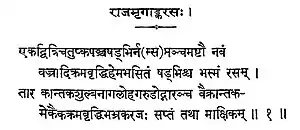 Rājamṛgāṅka is the title of a treatises in Sanskrit that deals with the preparation of Āyurvedic medicines.[1] Traditionally the authorship of the treatise is attributed to Bhojarāja (d.1055) of the Rajput Paramāra dynasty, rulers of the Malwa region in central/western India. However, modern scholarship attributes the authorship to some anonymous experienced Ayurvedic physician from South India.[2]
