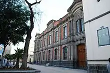 The complex was built with masonry, tezontle and other stone.[3] The church portion remains open to worship and visitors, but the former convent area is mostly closed to visitors. Much of the building is dedicated to the Concepción Beistegui Hospital, a senior citizen’s facility.[6][7] The complex also has a rental hall, a conference hall and a garden with a tile fountain that dates to 1930, as well as 26 gold sconces and many valuable paintings and sculptures.[3] One of the courtyards is called the Patio de la Estampa, which was originally covered. It only conserves one of its arches and parts of others.[9] In 2008, the Sor Juana Salon was inaugurated, dedicated to the Mexican nun from the 17th century .[6] The plaza is located in front of the former convent and church. The plaza contains green areas, benches and a pedestrian corridor. On the opposite side from the church are homes and local businesses.[2]