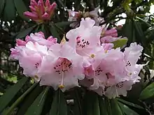 Rhododendron calophytum, the beautiful-face rhododendron,[1] is a species of flowering plant in the heath family Ericaceae that is native to the forests of central and eastern China, where it lives at altitudes of 1,400–4,000 m (4,600–13,100 ft).[2] Growing to 12 m (39 ft) tall and 8 m (26 ft) broad, it is a substantial evergreen shrub. The leathery leaves are narrow and up to 30 cm (12 in) long. In early Spring trusses of bell-shaped, white or pale pink flowers, spotted with maroon inside, are produced.[3]