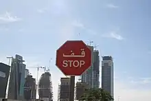 Road signs in United Arab Emirates are modelled on the British road sign system[1] that are regulated by the Road Traffic Authority (RTA) Dubai and Department of Transport (DoT) Abu Dhabi. The English language typeface is Transport and the Arabic language typeface is Naskh.[2]