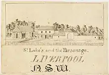 "St Luke's and the Parsonage, Liverpool, N.S.W." From Views of Sydney and Surrounding District, by Edward Mason (c.1821–1823)
