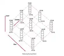 Palletizing is one of the more popular applications for robots, and is accomplished by combining a series of commands into a palletizing routine. A RoboLogix palletizing routine consists of five program instructions, or lines. The first instruction is the Palletize instruction, which is followed by a linear motion instruction to move to the stack point. The stack point is the top-center of the workpiece, and a group of stack points forms a stacking pattern, as shown in the adjacent image. The first stack point in a stacking pattern is located at (1,1,1) (row, column, layer) and is incremented each time the palletizing routine is executed.