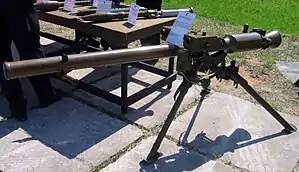 The SPG-9 Kopyo (Russian: СПГ-9 Копьё, transliterated Russian: Stankovyi Protivotankovyi Granatomet "Kopyo" - Heavy Antitank Grenade Launcher "Spear") is a tripod-mounted man-portable, 73 millimetre calibre recoilless gun developed by the Soviet Union. It fires fin-stabilised, rocket-assisted high explosive (HE) and high-explosive anti-tank (HEAT) shaped charge projectiles similar to those fired by the 73 mm 2A28 Grom low pressure gun of the BMP-1 armored vehicle. It was accepted into service in 1962, replacing the B-10 recoilless rifle.