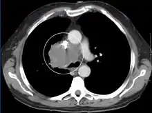The main techniques of diagnosing SVCS are with chest X-rays (CXR), CT scans, transbronchial needle aspiration at bronchoscopy and mediastinoscopy.[6] CXRs often provide the ability to show mediastinal widening and may show the presenting primary cause of SVCS.[6] However, 16% of people with SVC syndrome have a normal chest X-ray. CT scans should be contrast enhanced and be taken on the neck, chest, lower abdomen, and pelvis.[6] They may also show the underlying cause and the extent to which the disease has progressed.[6]