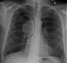 A CXR of a person with lung cancer, which was causing superior vena cava syndrome