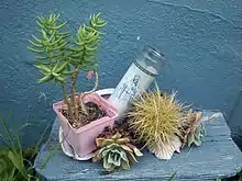 Rituals dedicated to Santa Muerte include processions and prayers with the aim of having a miracle granted.[10] Some believers of Santa Muerte remain members of the Catholic Church,[20] while others are cutting ties with the Catholic Church and founding independent Santa Muerte churches and temples.[39] Santa Muerte altars generally contain one or multiple images of the saint, generally surrounded by any or all of the following: cigarettes, flowers, fruit, incense, water, alcoholic beverages, coins, candies and candles.[21][10] Tobacco is also used for personal cleansing and for cleansing statues of Santa Muerte [40]