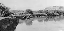 The Australian Mounted Division with the 1st Light Horse Brigade, the Hong Kong and Singapore Mountain Artillery Battery and the 12th Light Armoured Motor Battery (LAMB) attached, crossed the Ghoraniyeh bridge at 04:00 on the morning of 30 April.[72] The 4th Light Horse Brigade with the Australian Mounted Division's "A" and "B" Batteries HAC and the Nottinghamshire Battery RHA attached led the 3rd Light Horse Brigade 16 miles (26 km) north from the Ghoraniyeh bridgehead up the flat eastern bank of the Jordan towards Jisr ed Damieh.[39][84][85]
