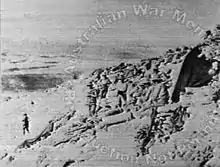 The infantry attack was launched in bright moonlight at the same time as the Australian light horse galloped north along the eastern bank of the Jordan River towards Jisr ed Damieh.[81] By 02:15 leading infantry battalions were deployed opposite their first objectives which were 500–700 yards (460–640 m) away.[67] The infantry captured the advanced German and Ottoman outposts line in the first rush but the second line of solid entrenched works were strongly defended and by mid morning cross-fire from concealed machine guns had brought the advance to a standstill.[53][81] As soon as the 179th Brigade on the left emerged from cover to attack El Haud they were seen in the moonlight and fired on by these machine guns. Some slight progress was made by the 2/14th Battalion, London Regiment, 179th Brigade which captured 118 prisoners but progress became impossible due to heavy and accurate machine gun fire. Before dawn the 180th Brigade on the right made three attempts to gain two narrow paths but was fired on by machine guns and failed to reach their objective; the 2/20th Battalion, London Regiment managed to decisively defeat a reserve company killing 40 German or Ottoman soldiers and capturing 100 prisoners.[82]