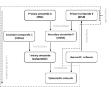 Molecules that are not produced by an organism are referred to as asemantic molecules, because they do not contain any genetic information. Asementic molecules may be changed into episemantic molecules by anabolic processes. Asemantic molecules may also become semantic molecules when they integrate into a genome. Certain viruses and episomes have this ability.[1]