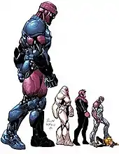 • Adamantium Cyborgs - Near-fully mechanical mutant hunter killers refitted by Weapon X with the titular metal as an endoskeleton using sentinel based nanotech. Coming in numerous alphabetical categorical batches, these bionic weapons can shed their skin revealing a murderous automaton with the abilities of various X-Men heroes & villains integrated into them.[28]