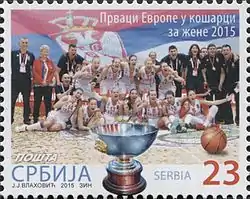 EuroBasket 2015 champions on a 2015 Serbian stamp.