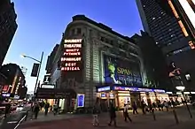 The Shubert is part of the largest concentration of Broadway theaters on a single block.[9] It adjoins six other theaters: the Majestic and Broadhurst to the west; the John Golden, Bernard B. Jacobs, and Gerald Schoenfeld to the northwest; and the Booth to the north. Other nearby structures include the Row NYC Hotel to the west; the Music Box Theatre and Imperial Theatre one block north; One Astor Plaza to the east; 1501 Broadway to the southeast; Sardi's restaurant to the south; and the Hayes Theater and St. James Theatre to the southwest.[5] The Broadhurst, Schoenfeld (originally Plymouth), Booth, and Shubert theaters were all developed by the Shubert brothers between 44th and 45th Streets, occupying land previously owned by the Astor family.[10][11] The Shuberts bought the land under all four theaters from the Astors in 1948.[11][12]