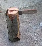 The side knife may be used as a light froe, for splitting small billets of wood.[1] It is driven through the billet using a hammer. Unlike a froe's extended handle, the side knife does not permit twisting to lever the split open and so it must be driven through all the way.