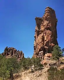 Sierra de Órganos is nestled within the Sierra Madre Occidental mountain range, in an area that corresponds to the physiographic province of the Mexican Plateau. The topography is uneven, with elevations ranging from 2,120 to 2,560 metres (6,960 to 8,400 ft) above sea level.[1] This gives rise to dramatic ridges and steep peaks that form small plateaus, often with very prominent, nearly vertical cliff faces. Small valleys surrounding the peaks afford scenic views of the rock formations from below.[5]