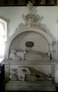 He was buried in St Michael's Church, Farway, where his monument showing under a recessed arch his recumbent effigy dressed in lawyer's robes, with hands together in prayer above his chest. A semi-recumbent effigy, possibly of his son, is below, shown fully dressed in armour with his bare head resting on a plumed helm.[13][14] Above Sir Edmund's effigy is a tablet inscribed: