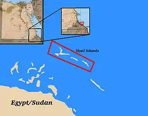 The Siyal Islands are a group of islands off the coast of northeastern Africa, located in the Red Sea. The islands are located in the Halaib Triangle, which is claimed by both Sudan and Egypt, as part of an ongoing border dispute. Since the 1990s, the islands have been occupied by Egypt, and so the islands are de facto administered by Egypt. They remain, however, to be claimed by Sudan.