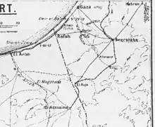 The strength of the Yildirim Army Group units holding the Gaza to Beersheba line was estimated at 40,000 rifles, although the figure was later found to be closer to 33,000 rifles, 1,400 sabres and 260 guns, including the reserve 19th Division at 'Iraq el Menshiye, and the 12th Depot Regiment at Hebron.[17][Note 3] While both Sheria and Beersheba were particularly strongly fortified by the Ottoman defenders, there were permanent strongly entrenched and wired positions stretching from the sea at Gaza to Shellal on the Wadi Ghazzeh.[44][45]