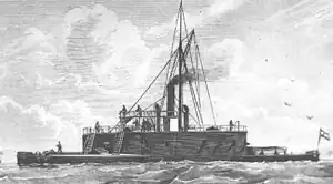 Designed and constructed by the Reales Astilleros de Esteiro at Ferrol[1] to meet an Armada requirement for a floating battery capable of providing gunfire support to troops ashore during the Third Carlist War, Duque de Tetuán was of wooden construction, its hull plated with iron armor 100 millimetres (3.9 in) thick.[2] Some of the armor plate used in the construction of Duque de Tetuán came from the earlier armoured frigate Tetuan,[3] which had burned under suspicious circumstances during the Cantonist rebellion at Cartagena.[4]