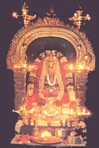 The main deity Venkatesa Perumal is in the form of Swayambu. The vision of the Lord and his benign presence fill the devotees’ heart with peace and calm. The presiding deity, (Utsava Moorthy) Sri Venkatesa Perumal gives us his darshan along with his consorts, Sri Devi and Bhudevi.