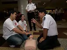 Volunteers are provided with progressive training and re-training opportunities and can complete a number of first aid qualifications. Training for basic to intermediate skill sets are usually provided at Divisional-level, whereas training for additional and enhanced skills such as ambulance driving and handling, management of mass-casualty incidents, as well as the use of an automated external defibrillator ("AED") are centrally conducted by suitable qualified trainers at the State/Regional Headquarters or Area Headquarters.