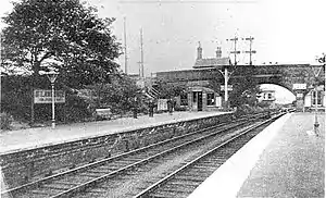 Principally to cater for the very occasional train avoiding Ramsgate, a station was opened to the west of the spur by the Newington Road Bridge (now the B2014).[6][10] The station opened in October 1864 and was named St Lawrence (Pegwell Bay)[11][12] after nearby St Lawrence village which was swallowed up in the suburbs of Ramsgate in the early 20th century.[13] The station was also shown as St Lawrence for Pegwell Bay in some timetables,[11] and on the station nameboards, highlighting the proximity of Pegwell Bay. The two facing platforms were to the west of the bridge, while the station building was to the east.[14] Offices were constructed in the two arches either side of the tracks.[13]