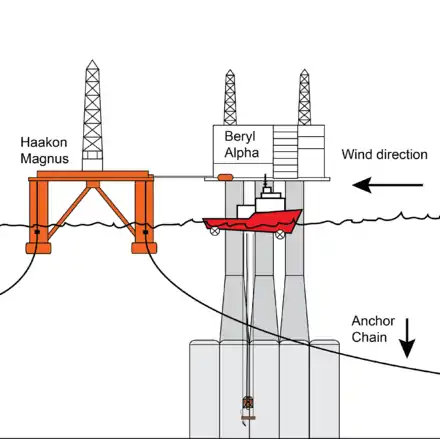 The weather forecast now predicted that there would be a change in wind direction from west to north, and that conditions "would worsen later in the day" with wind speeds gusting to 35 knots.[12] The Canopus was only a year old, and although it represented the latest and best technology of that era, the limits of her dynamic positioning system were 18–20 knots with the wind hitting her broadside.[13]