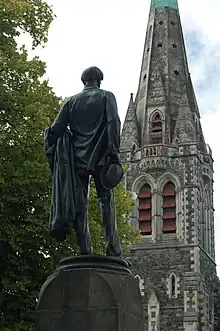 The statue, by English sculptor Thomas Woolner, was cast in the Coalbrookdale foundry in Shropshire in 1865. It was unveiled by magistrate Charles Bowen in Cathedral Square on 8 August 1867.[3][4] In 1904, a Christchurch City Councillor advocated for the statue to be moved, as the soon to be built trams would not leave enough space around it. In 1907, the City Council gave permission for the erection of a tram shelter to be built that completely hid the statue from view from the cathedral. In 1917, the situation was made worse by the construction of underground toilets right next to the statue. Finally, on 5 March 1918, the statue was shifted to a new position to the north of ChristChurch Cathedral.[4][5]