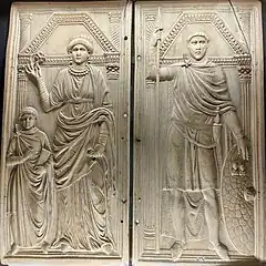 ![]() Ivory diptych, possibly of Stilicho (right) with his wife Serena and son Eucherius, c. 395 (Monza Cathedral). It may instead depict Aetius.[1] | |