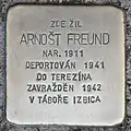 Arnošt Freund was born on 23 September 1911. His father was Emil Freund. He had at least one sister, Louise, born 1916, later married as Hermanová. He was a school mate of Oskar Schindler. He became a dentist and was married to Irmina or Irma née Strumpf. The couple had a son - Jiří, born on 11 December 1937. The family lived in Brno. On 2 December 1941 he, his wife and his son were deported from Brno to Theresienstadt concentration camp with transport G. Their numbers on this transport were 64, 65 and 66 of 1,001. From there on 25 May 1942 he was transferred, again with his family, to the Izbica Ghetto with transport Az. Their numbers on this transport were 583, 584 and 585. With this train, 997 people were deported, only one survived. Arnošt Freund, his wife and his 4 years old son were murdered.[8][9][10][11]
