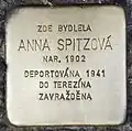 Anna Spitzová was born on 17 February 1902 in Brandýs nad Labem. She was married to Ařnost Spitz, the couple had two daughters, Marie (born 1928) and Sonja (born 1931). The family's last place of residence before deportation was in Prague XIX, Hoferova 3. On 10 December 1941 father, mother and daughter were brought from Prague to Theresienstadt concentration camp by transport L t. Their transport numbers were 295, 296 and 298 of 1,006. There, the family was interned for almost three years and were finally separated. On 28 September 1944, Ařnost Spitz was deported to Auschwitz concentration camp by Transport Ek. Eight days later, on 6 October 1944, Anna and Sonja Spitzová were deported to Auschwitz. Their transport numbers were 75 and 77 of 2,500. In the end, all three were murdered by the Nazi regime, but the place and date of death are known of Ařnost Spitz: January 18, 1945 in the Dachau concentration camp.[33]