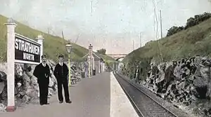 The first station at Strathaven was the terminus of the Hamilton and Strathaven Railway at Flemington, taken over by the Caledonian Railway; and replaced as a passenger station by Strathaven North railway station in 1904. Strathaven North opened in October 1904, closed temporarily during World War I; and closed permanently on 30 September 1945. The journey along the length of the line took around forty minutes and there were about six return journeys each day.[2]