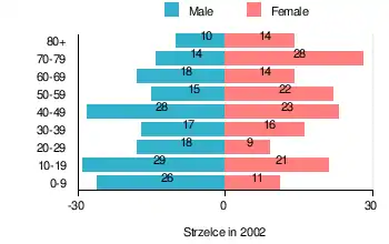 According to the 2002 Poland census, there were 333 people residing in Strzelce village, of whom 52.6% were male and 47.4% were female. In the village, the population was spread out, with 21.9% under the age of 18, 32.4% from 18 to 44, 18.9% from 45 to 64, and 26.7% who were 65 years of age or older.[1]
