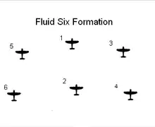 One tactical innovation adopted by 2nd TAF Spitfires was the "Fluid Six"' formation, which had been developed through combat experience in Europe and North Africa. The first use of the tactic dated back to at least November 1941. It is known that No. 112 Squadron RAF used this in the North African campaign.[99] This formation "was considered the best fighter formation of the war".[100] It abandoned the leader-wingman combination that had existed before. Instead, it was based on three pairs of Spitfires which could provide mutual cover and support: the pairs were 'stacked' in altitude so that the pair (e.g.: 5 & 6) flying up-sun, and covering the tails of the leaders (1 & 2), flew higher, while the other pair (e.g.: 3 & 4) flew lower. Any attacking aircraft could be sandwiched between two pairs of Spitfires, no matter the direction or altitude of the attack. Another advantage of this formation was that when operating at squadron strength a flight commander was able to lead six aircraft of his own flight, "whereas, with formations of four there would more likely be one formation from each flight with the third consisting of aircraft from another flight."[100]