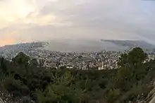 In nine minutes, the 1.5 km (1 mi) long Téléphérique line transports passengers from the bay of Jounieh, above the maritime highway and a pine-forested steep mountain, to an altitude of 650 meters, arriving at the Our Lady of Lebanon shrine in Harissa.[1] The trip offers "spectacularly dramatic views",[2] including panoramic views over the bay.[3] It is considered one of the most popular activities for tourists in Jounieh.[4]