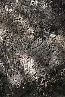 Above the heads are inscriptions in Luwian hieroglyphs; the symbols on the left can be grouped together, while the symbols on the right are not preserved. Their poor condition makes them difficult to read. Only the name of the left, female figure can be read, as "Ma-na-a-za/i". She is further identified as the "daughter of Lubakkis, the son of the military scribe." Another group of hieroglyphs are located to the left of the three figures, which name another person - John David Hawkins reads "Bodyguard Zida, servant of Hattusili, the Great King, the hero." This Zida is not depicted, but he is probably the creator of the relief.