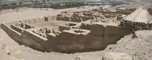 The site consists of several structures around a large central plaza. The central plaza is shaped like a trapezoid with its largest side being 150 m long. The main structures are grouped together in a northern part and a southern part (Sector Norte and Sector Sur). These structures are known as the Northern palace and the two Southern Palaces, flanked by an Ushnu (raised ceremonial platform) and a building known as the Utilities Structure.