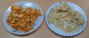 In Nagaland and Mizoram in Northeast India, tapioca is eaten as a snack. It is usually boiled with a bit of salt in water after skinning it, or snacks are made by drying the tapioca after cutting it. It is then powdered into flour and turned into dough to either make a fired or baked biscuit. In their local dialect, they call it kuri aloo, meaning "wood potato." All groups of society eat these chips as a delicacy. The skin of the tapioca, which is not edible for humans, is kept aside to prepare food for domesticated pigs.