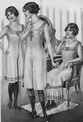 A one-piece undergarment which combined a camisole and knickers appeared in the 1910s under the name envelope chemise or chemi-knickers,[3] soon referred to as camiknickers.[5] The style remained fashionable into the 1920s, with examples being referred to as step-ins, combinations, camiknickers, cami-combinations, or cami-bockers at this time.[3]