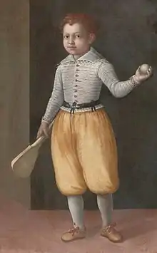 Historians believe that the game's ancient origin lay in 12th-century northern France, where a ball was struck with the palm of the hand.[13] Louis X of France was a keen player of jeu de paume ("game of the palm"), which evolved into real tennis, and became notable as the first person to construct indoor tennis courts in the modern style. Louis was unhappy with playing tennis outdoors and accordingly had indoor, enclosed courts made in Paris "around the end of the 13th century".[14] In due course this design spread across royal palaces all over Europe.[14] In June 1316 at Vincennes, Val-de-Marne, and following a particularly exhausting game, Louis drank a large quantity of cooled wine and subsequently died of either pneumonia or pleurisy, although there was also suspicion of poisoning.[15] Because of the contemporary accounts of his death, Louis X is history's first tennis player known by name.[15] Another of the early enthusiasts of the game was King Charles V of France, who had a court set up at the Louvre Palace.[16]