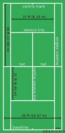 Tennis is played on a rectangular, flat surface. The court is 78 feet (23.77 m) long, and 27 feet (8.2 m) wide for singles matches and 36 ft (11 m) for doubles matches.[67] Additional clear space around the court is required in order for players to reach overrun balls. A net is stretched across the full width of the court, parallel with the baselines, dividing it into two equal ends. It is held up by either a cord or metal cable of diameter no greater than 0.8 cm (13 in).[66] The net is 3 feet 6 inches (1.07 m) high at the posts and 3 feet (0.91 m) high in the centre.[67] The net posts are 3 feet (0.91 m) outside the doubles court on each side or, for a singles net, 3 feet (0.91 m) outside the singles court on each side.