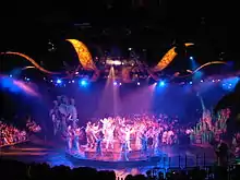 The show is performed inside an enclosed theater-in-the-round. Guests sit in four sections, each designated with an animal name: Giraffe, Elephant, Warthog, Lion. These animals are represented by large puppets on parade-style floats, which were originally built for Disneyland's The Lion King Celebration parade.[3] The show is hosted by four performers dressed in costumes inspired by traditional African dress. Each has a Swahili name: Kiume (meaning "masculine and strong"), Nakawa ("good-looking"), Kibibi ("princess"), and Zawadi ("the gift").