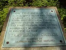 - ↑ "English: This memorial by the National Society of the Colonial Dames of America in the Commonwealth of Kentucky for "The Travelling Church, 1781" is also known as State Marker 25 and is located on KY 39/Lancaster Rd, SE of Lancaster, Garrard Co., KY, 40444; 37.577915, -84.558316. Text on marker: "In search of religious freedom, the Reverend Lewis Craig led his entire congregation of 200 Baptists and 400 other settlers from Spotsylvania County Virginia and established them here on Gilbert's Creek. This expedition, guided through the wilderness by Captain William Ellis, was the largest group of pioneers ever to enter the District of Kentucky in a single body. Erected by the National Society of the Colonial Dames of America in the Commonwealth of Kentucky. 1947."". 30 April 2011. Retrieved 18 August 2017 – via Wikimedia Commons.