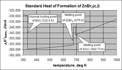 Standard molar heat of formation of ZnBr2(c,l) from the elements, showing discontinuities at transition temperatures of the elements and the compound.