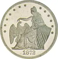 The bill provided, in part, for the striking of trade dollars which held legal tender status up to five dollars.[9] The legal tender provision was added by a last-minute rider at the behest of silver interests.[10] At the insistence of Ohio Senator John Sherman, the weight and fineness of the piece was indicated on the reverse, an attribution which numismatic historian Don Taxay found incomprehensible as "Chinese merchants would never understand them".[11]