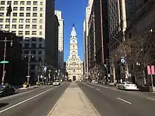 Broad Street, the main north–south street in Philadelphia, approaching Philadelphia City Hall