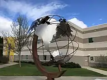 A large metallic globe near one of the school's main entrances. This globe was removed in 2020.